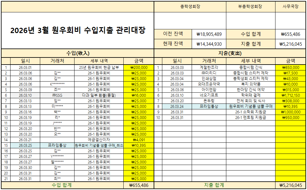 2026년 3월 원우회비 정산 내역