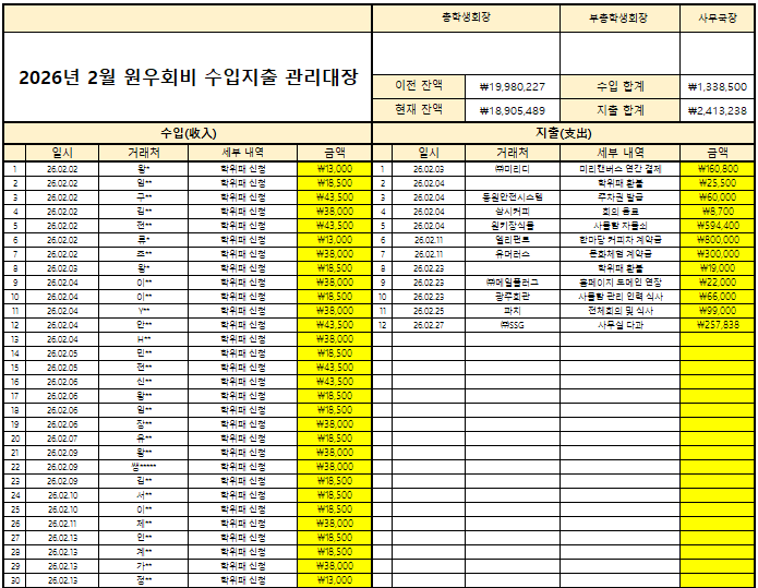 2026년 2월 원우회비 정산 내역