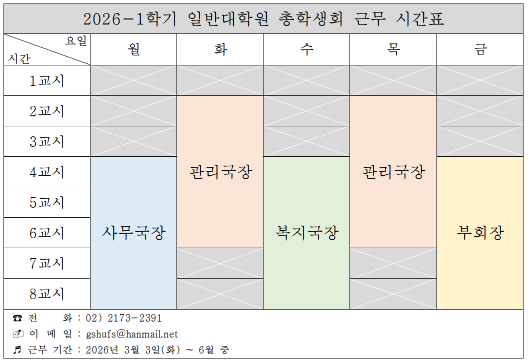 2026년 1학기 총학생회 근무 시간을 아래와 같이 안내드립니다.